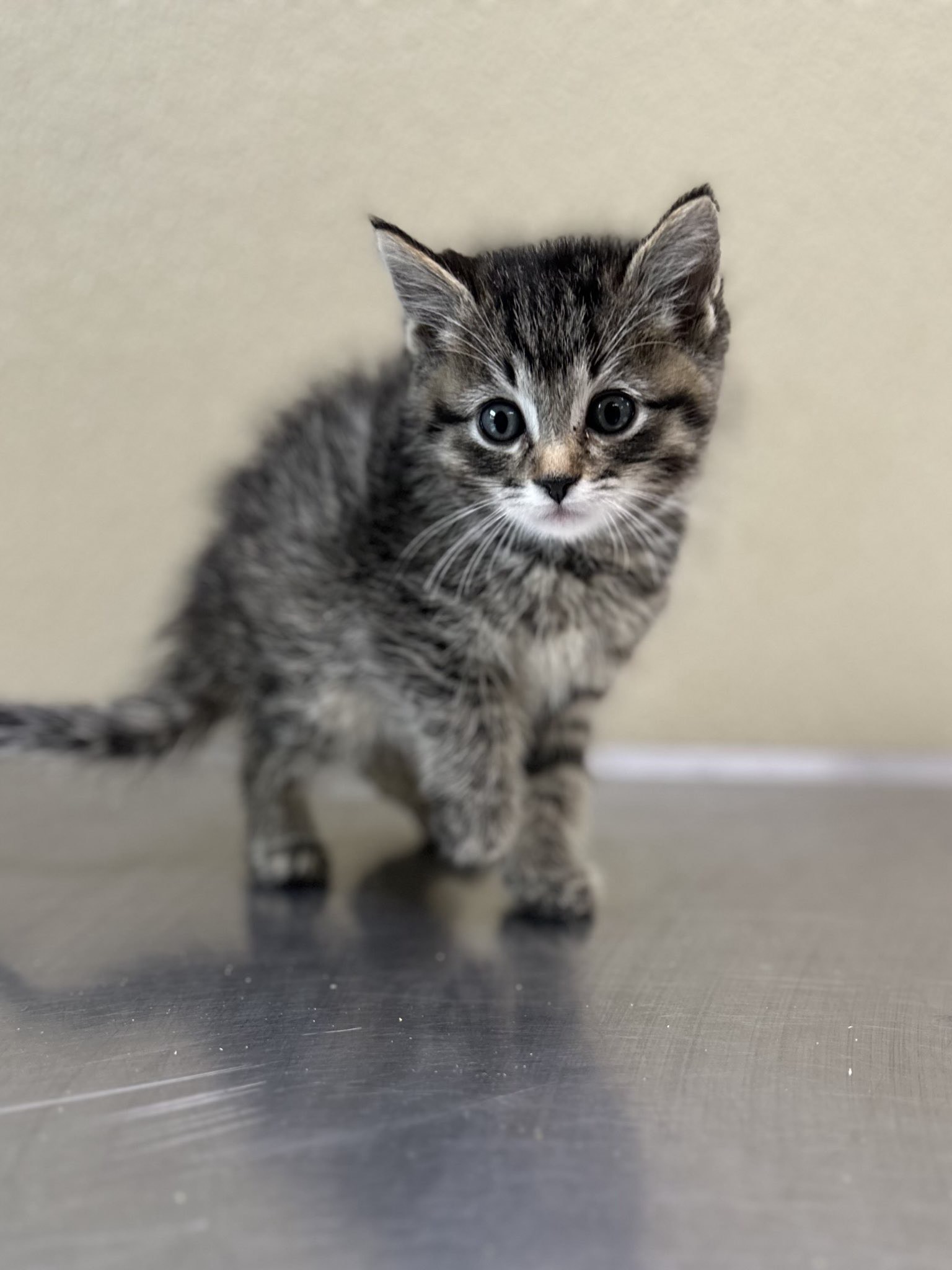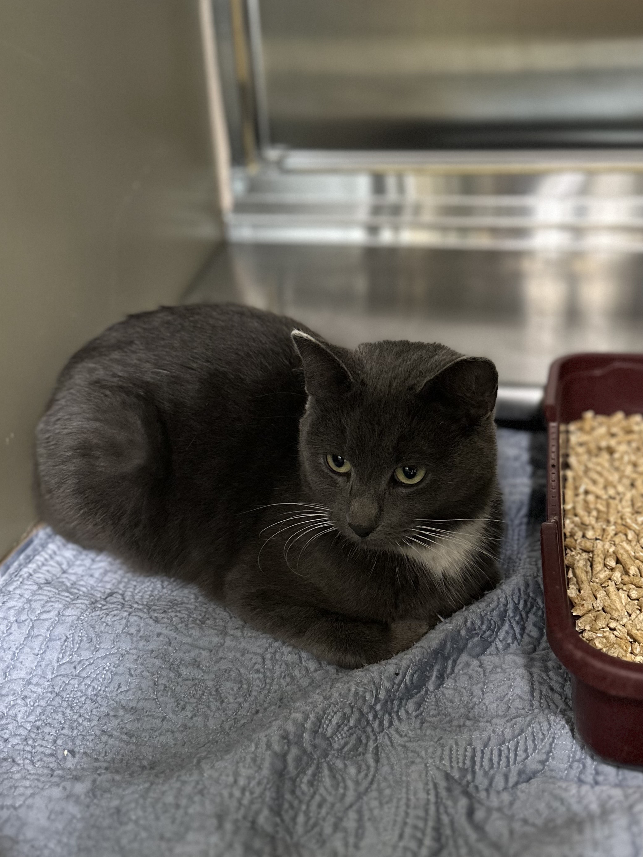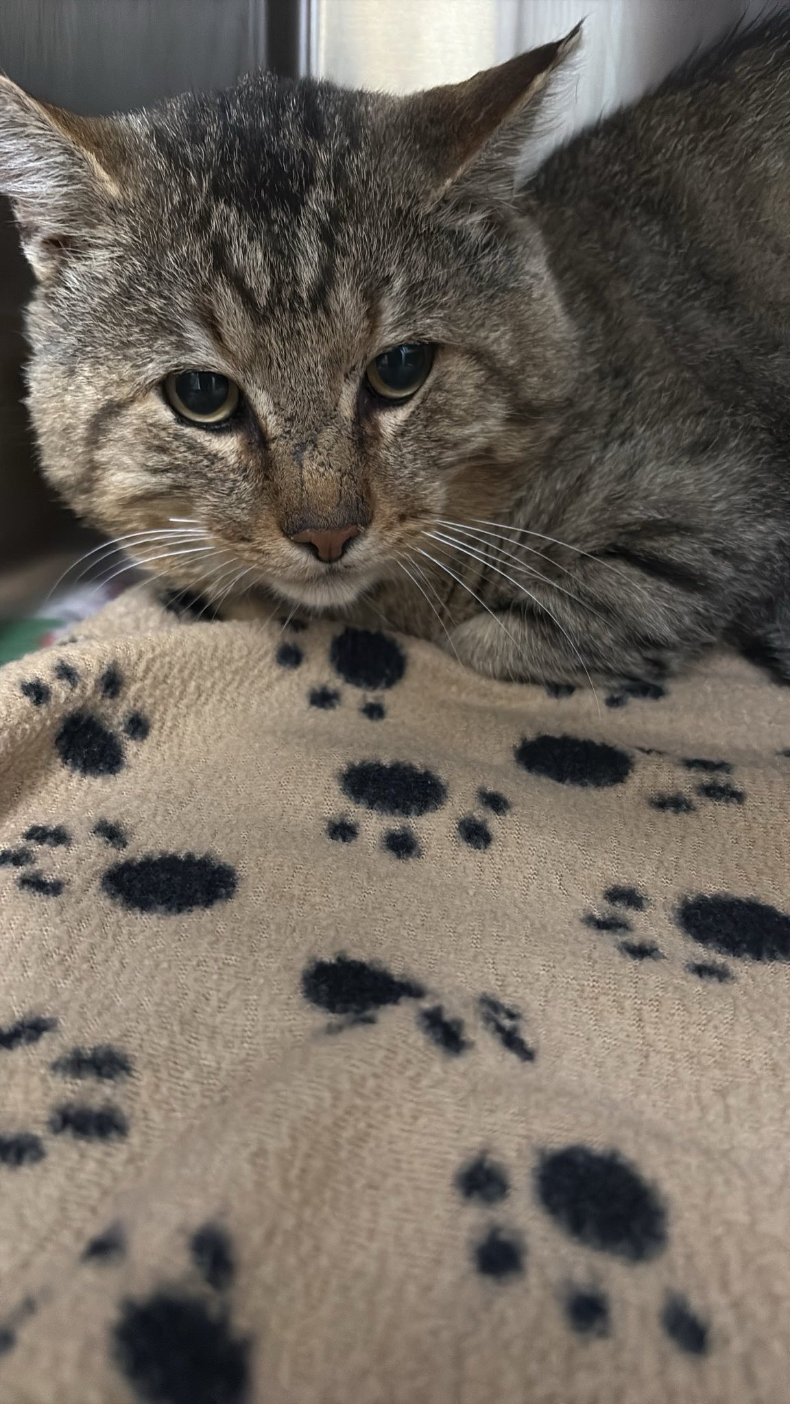 She is a female grey cat, white tips on front paws and white rear legs. Her sweetest quality is she has her left ear is missing !!