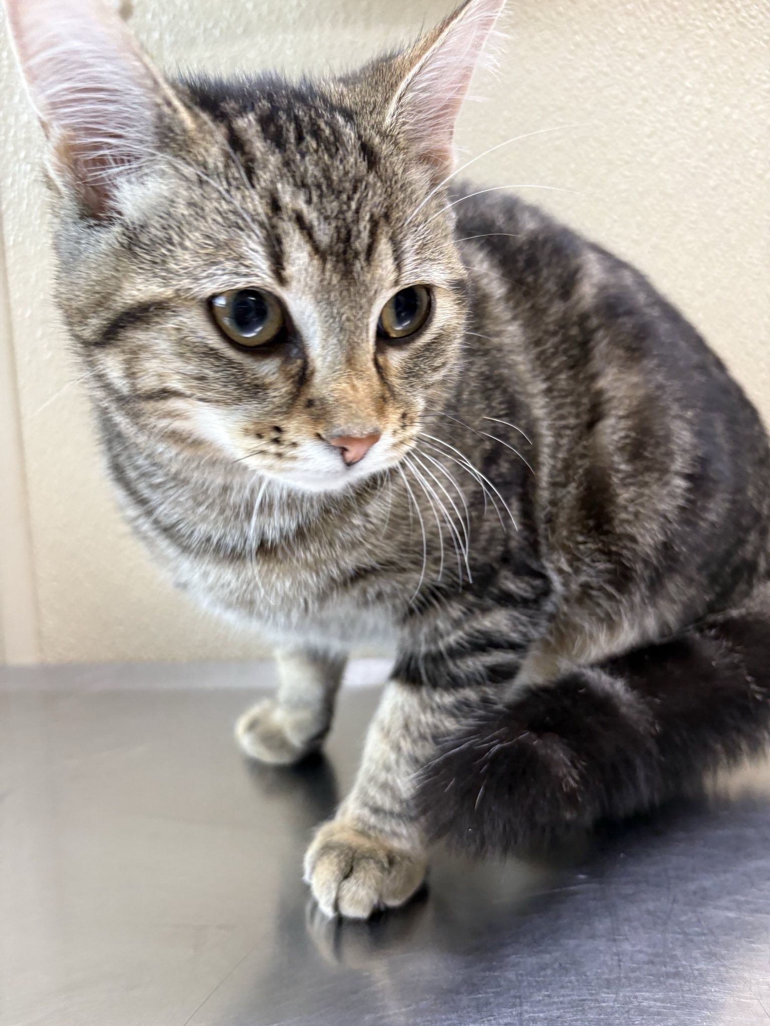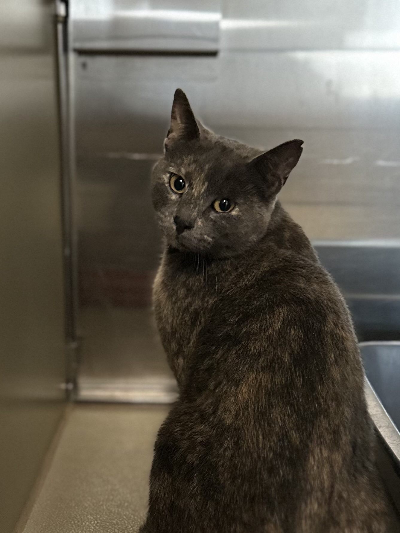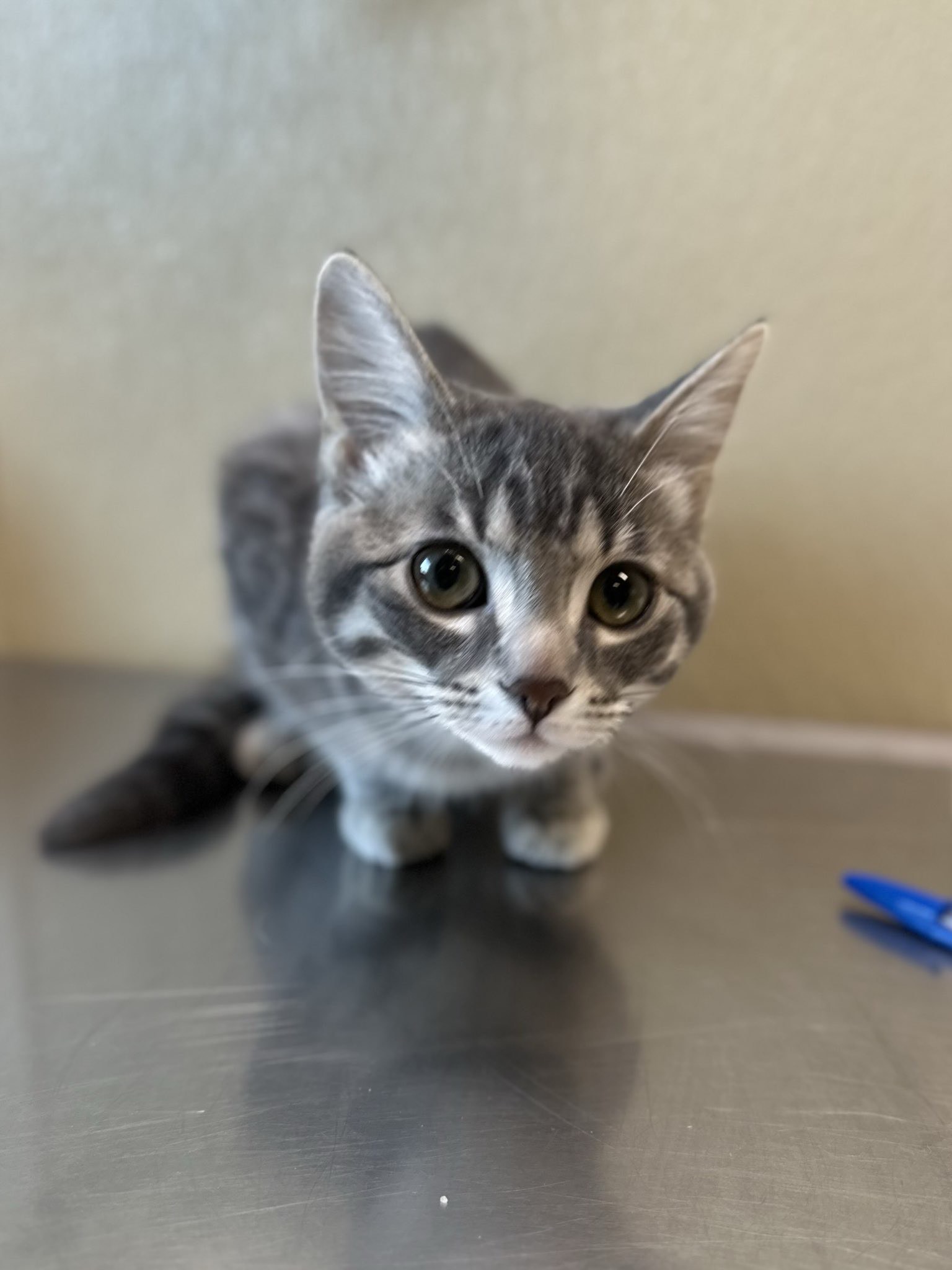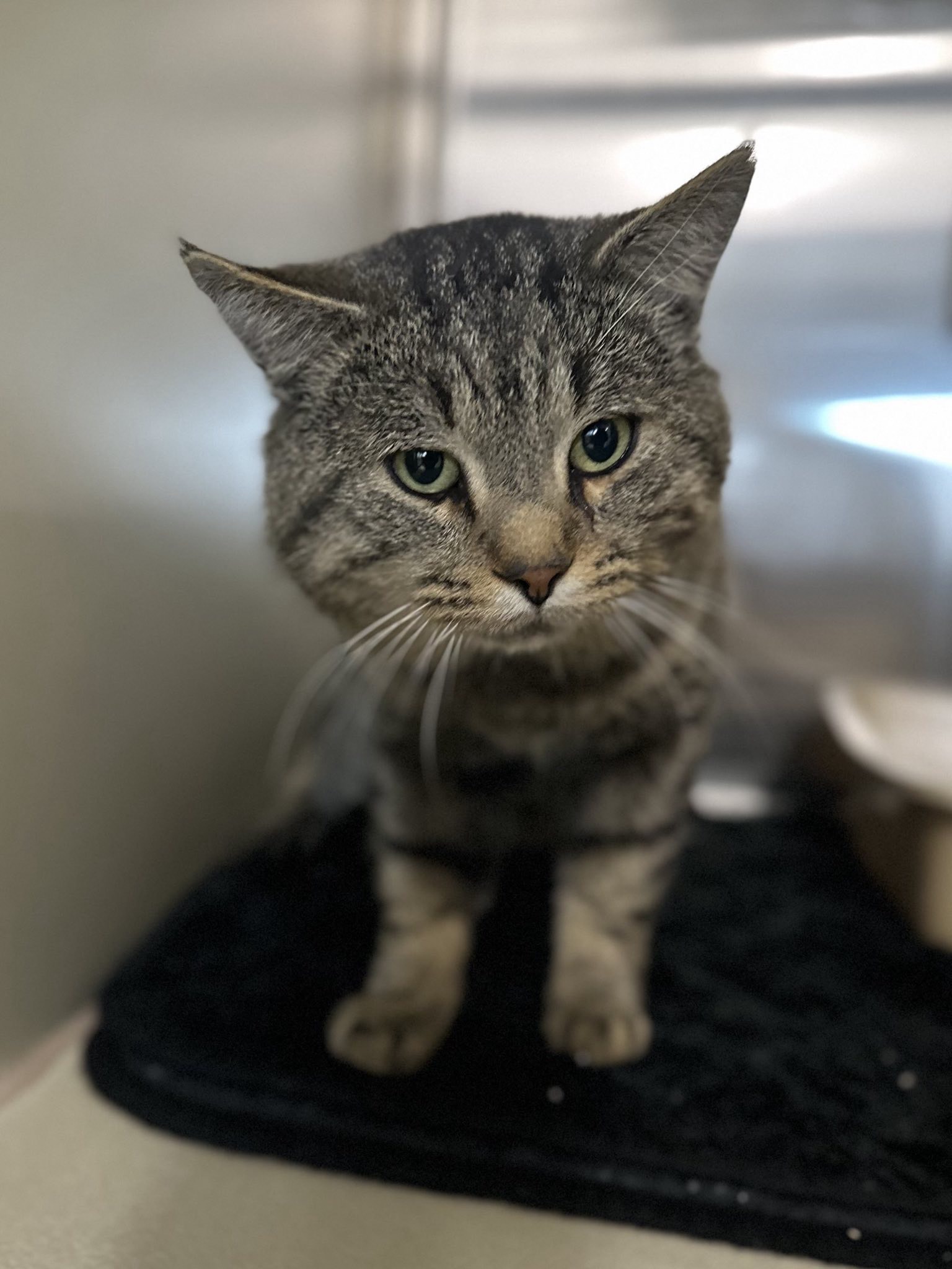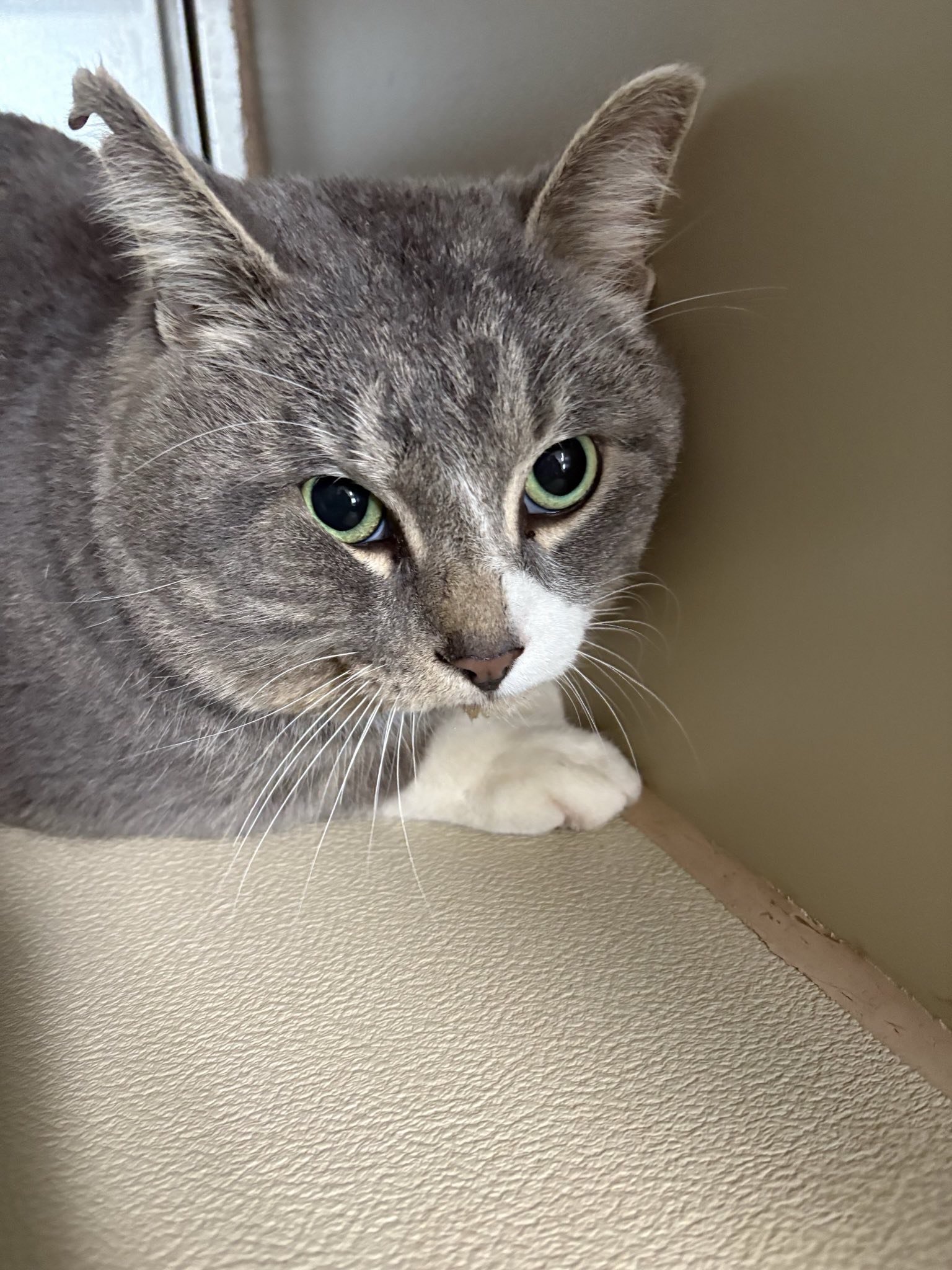 She is a female grey cat, white tips on front paws and white rear legs. Her sweetest quality is she has her left ear is missing !!