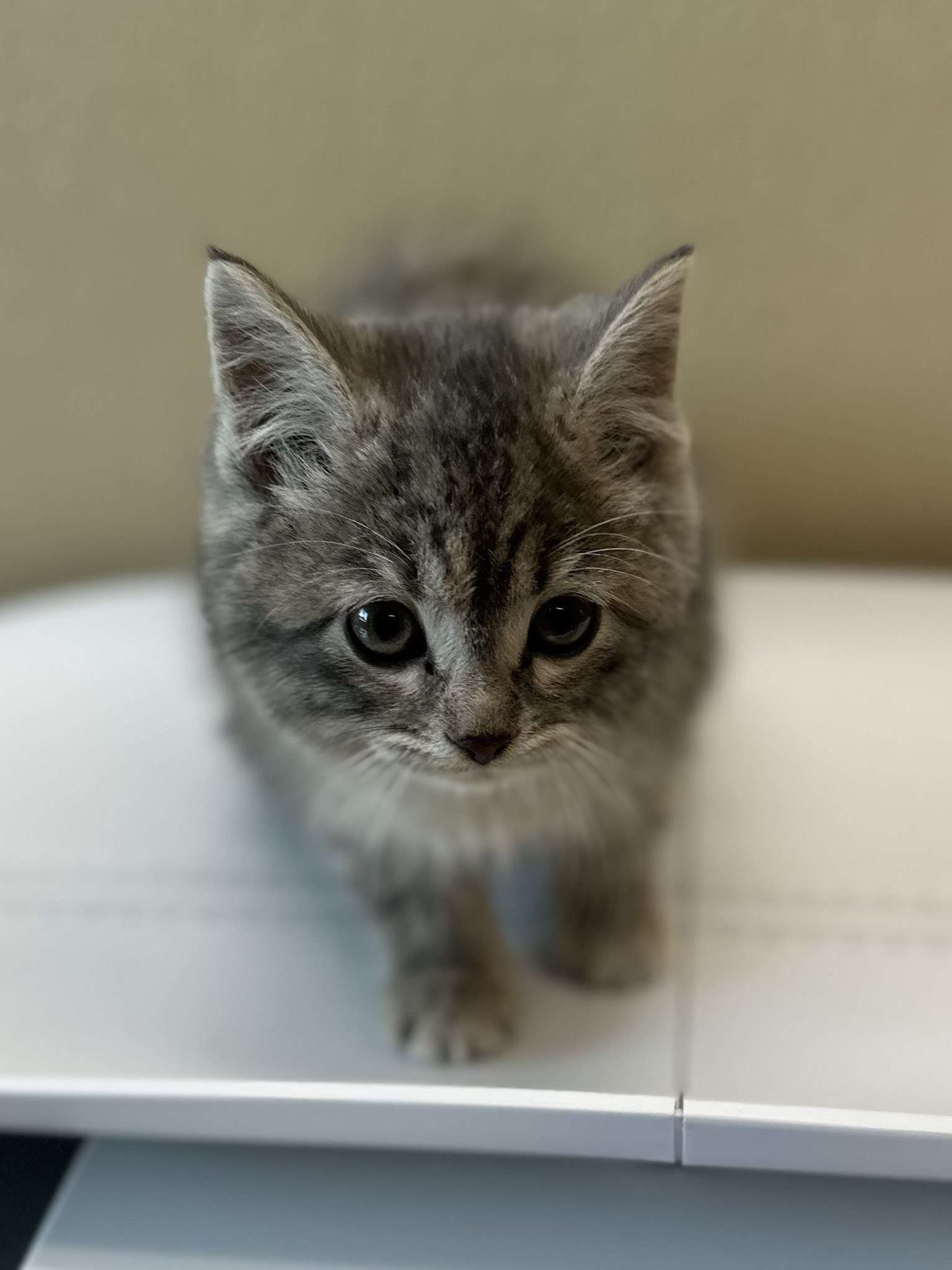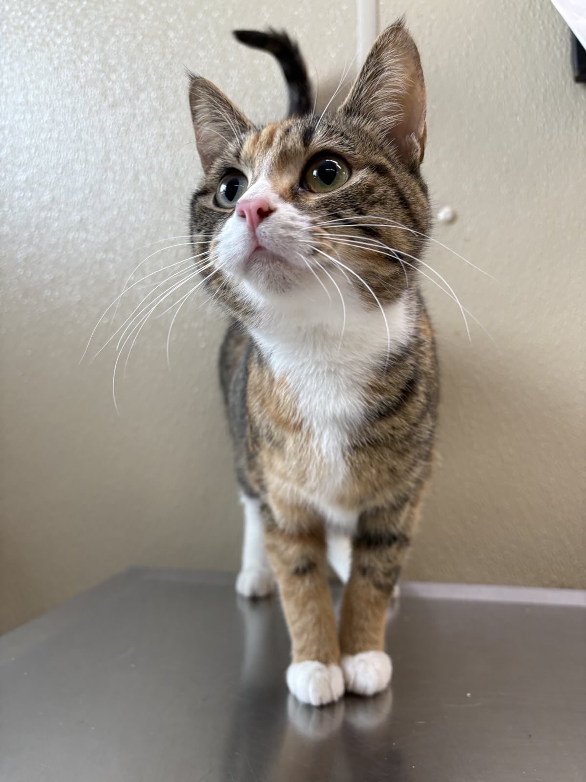 She is a female grey cat, white tips on front paws and white rear legs. Her sweetest quality is she has her left ear is missing !!
