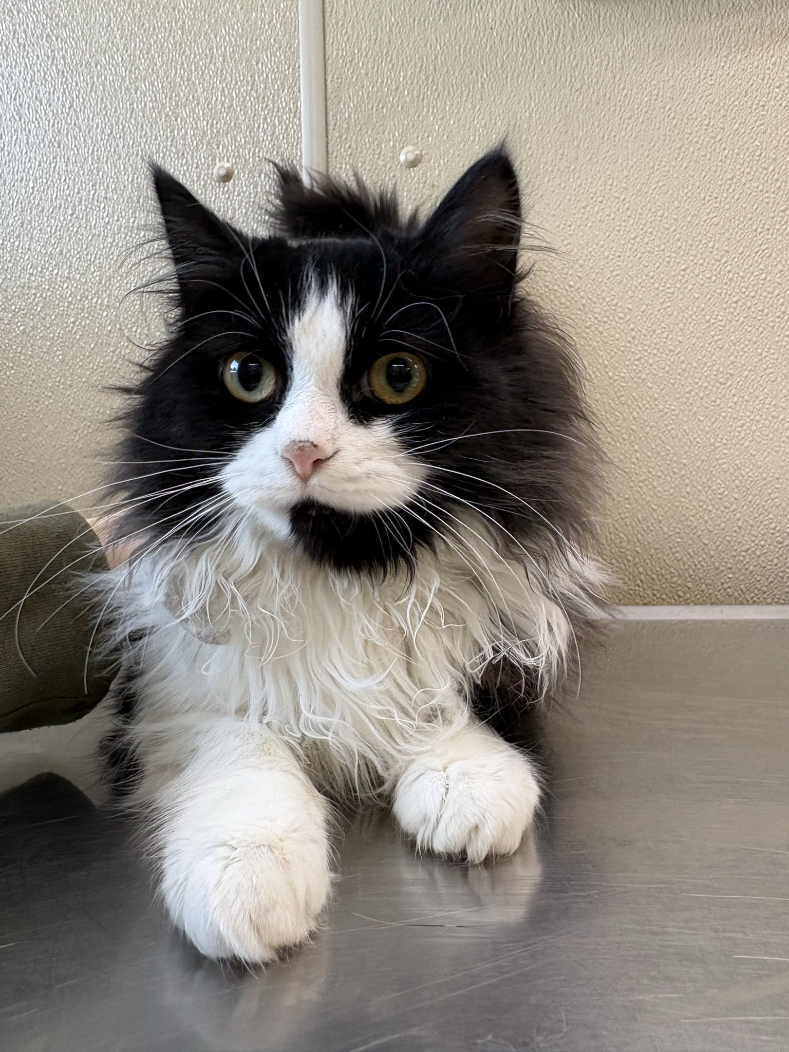 He is a large male tuxedo (9 months old but quite large for his age). He was last seen wearing a lime green collar.