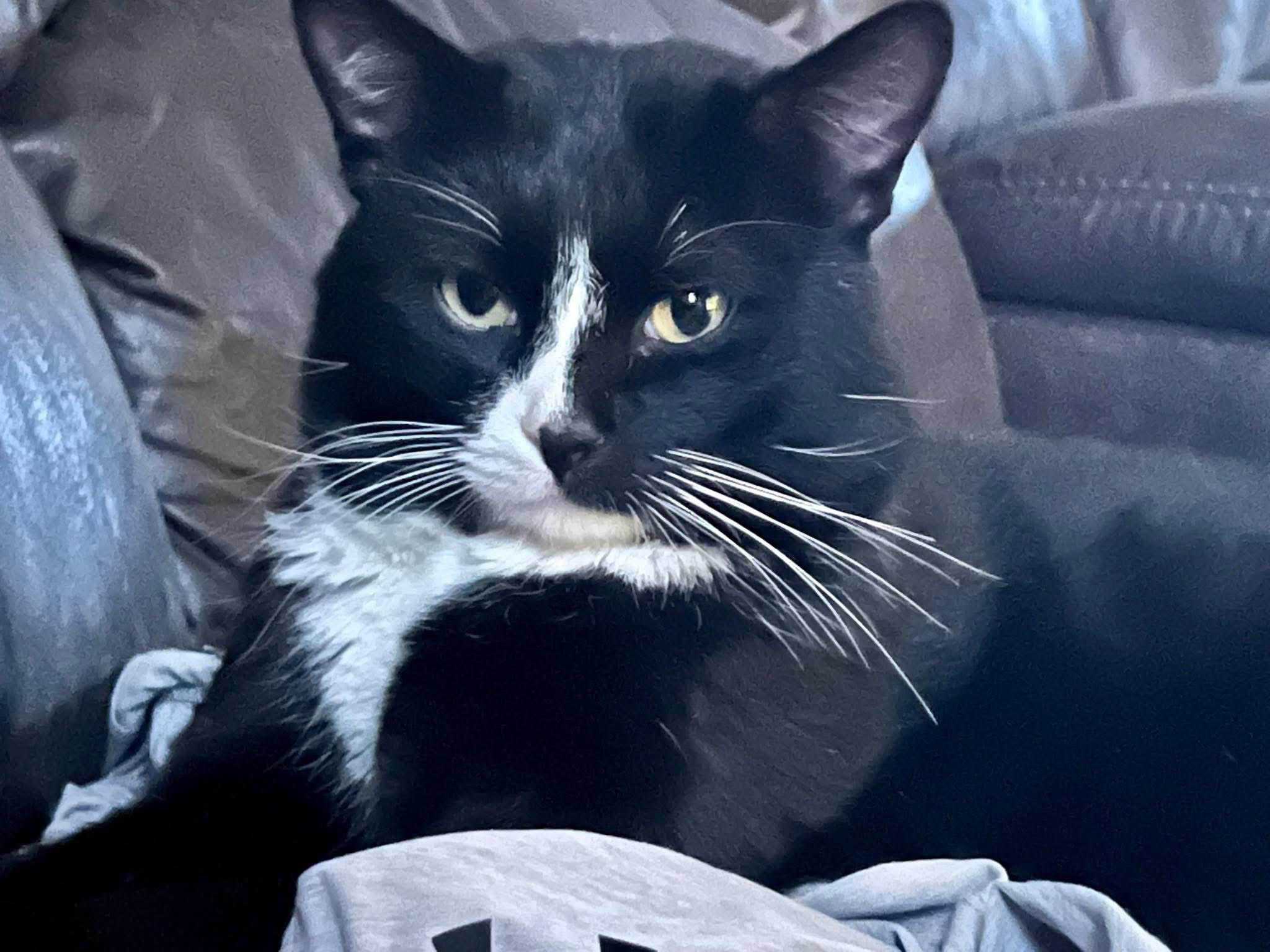 He is a large male tuxedo (9 months old but quite large for his age). He was last seen wearing a lime green collar.