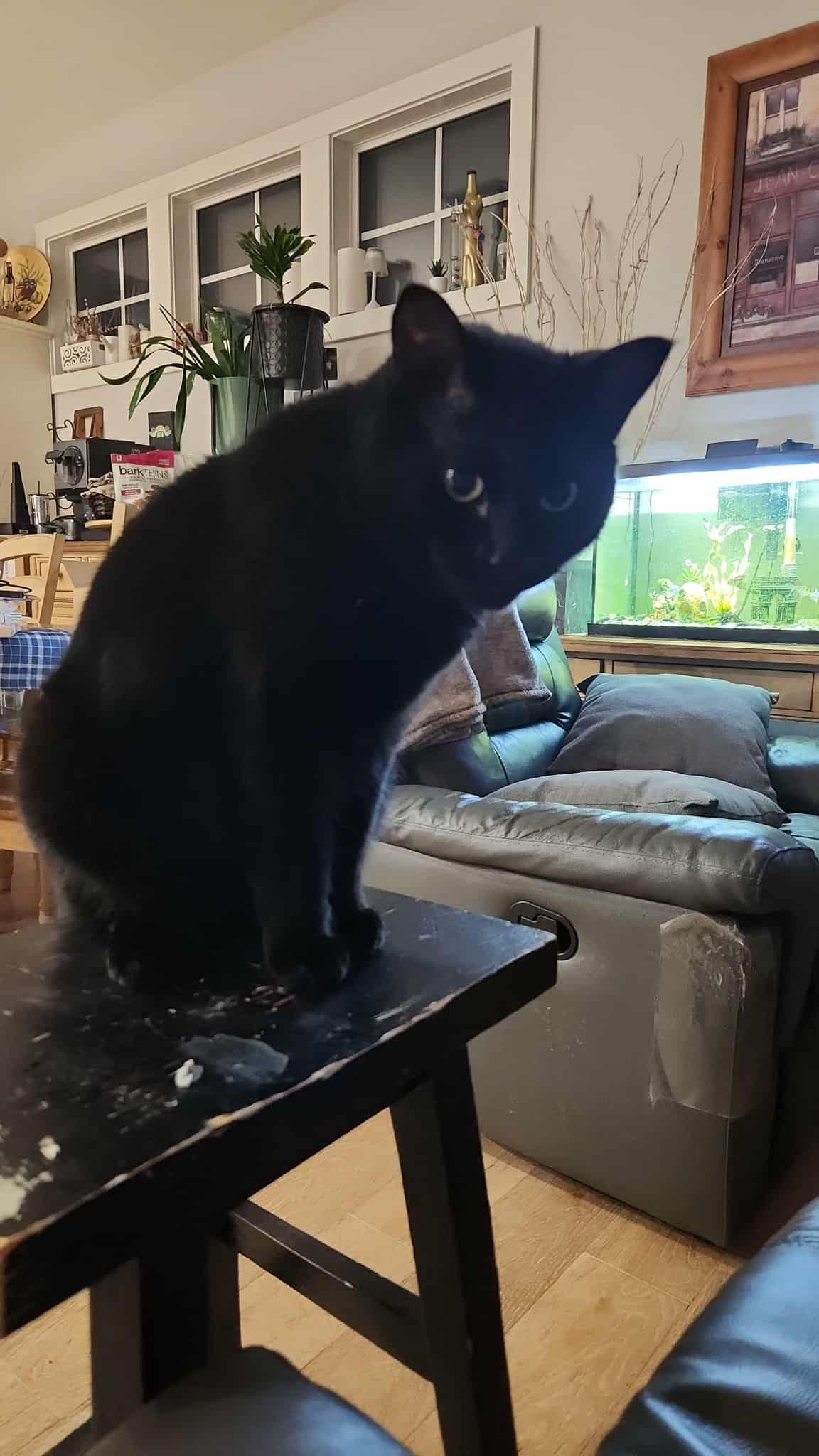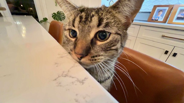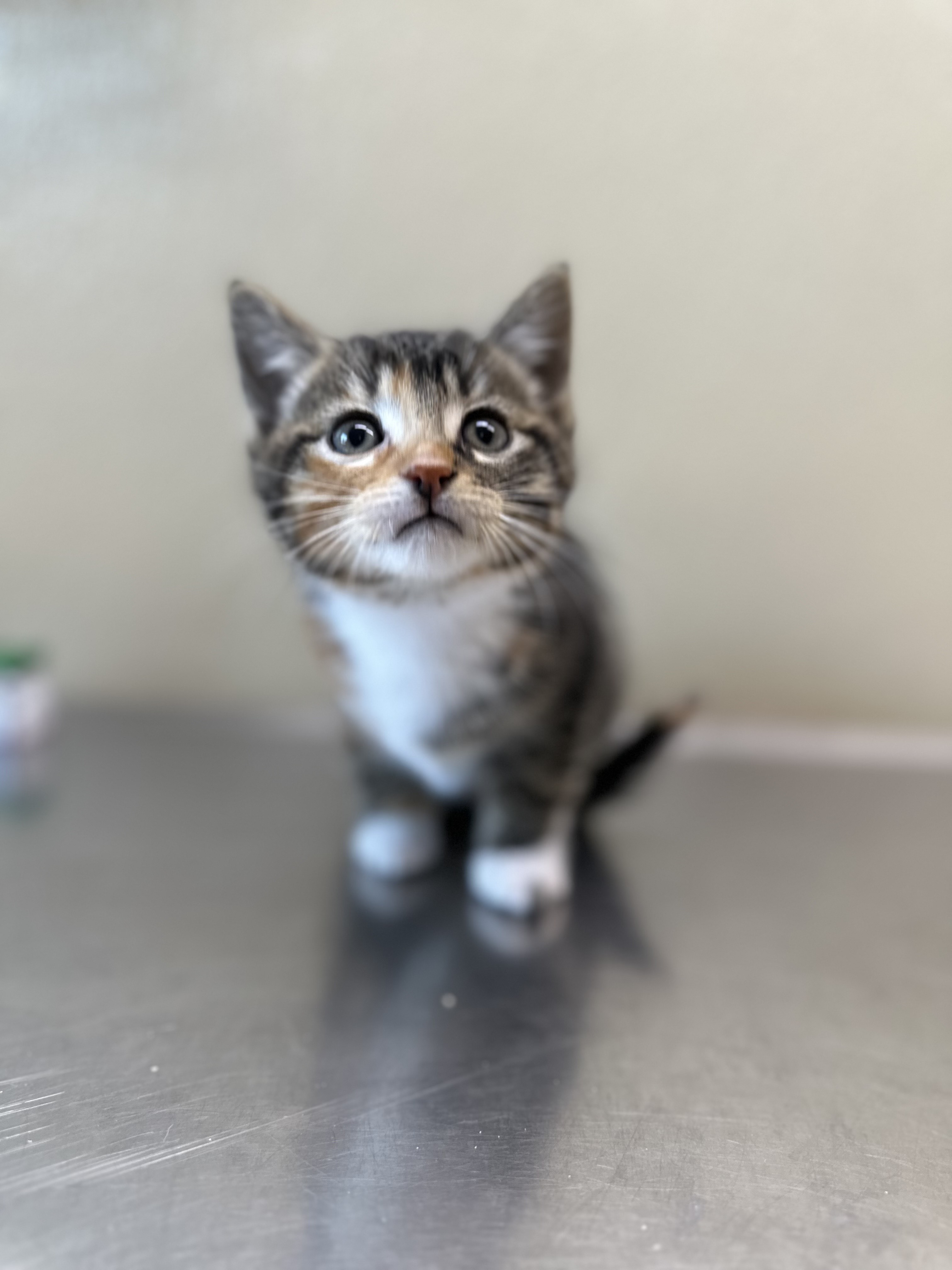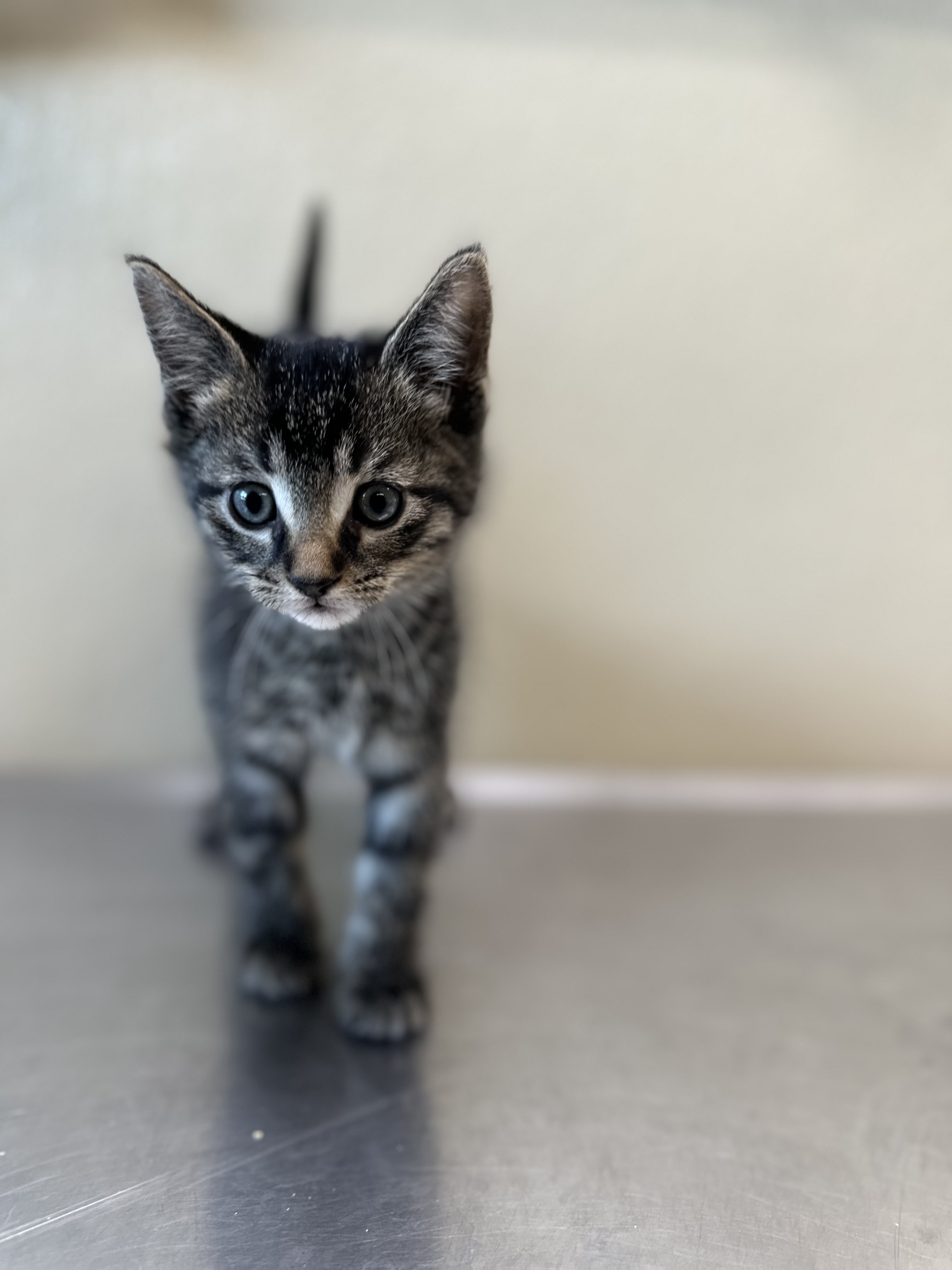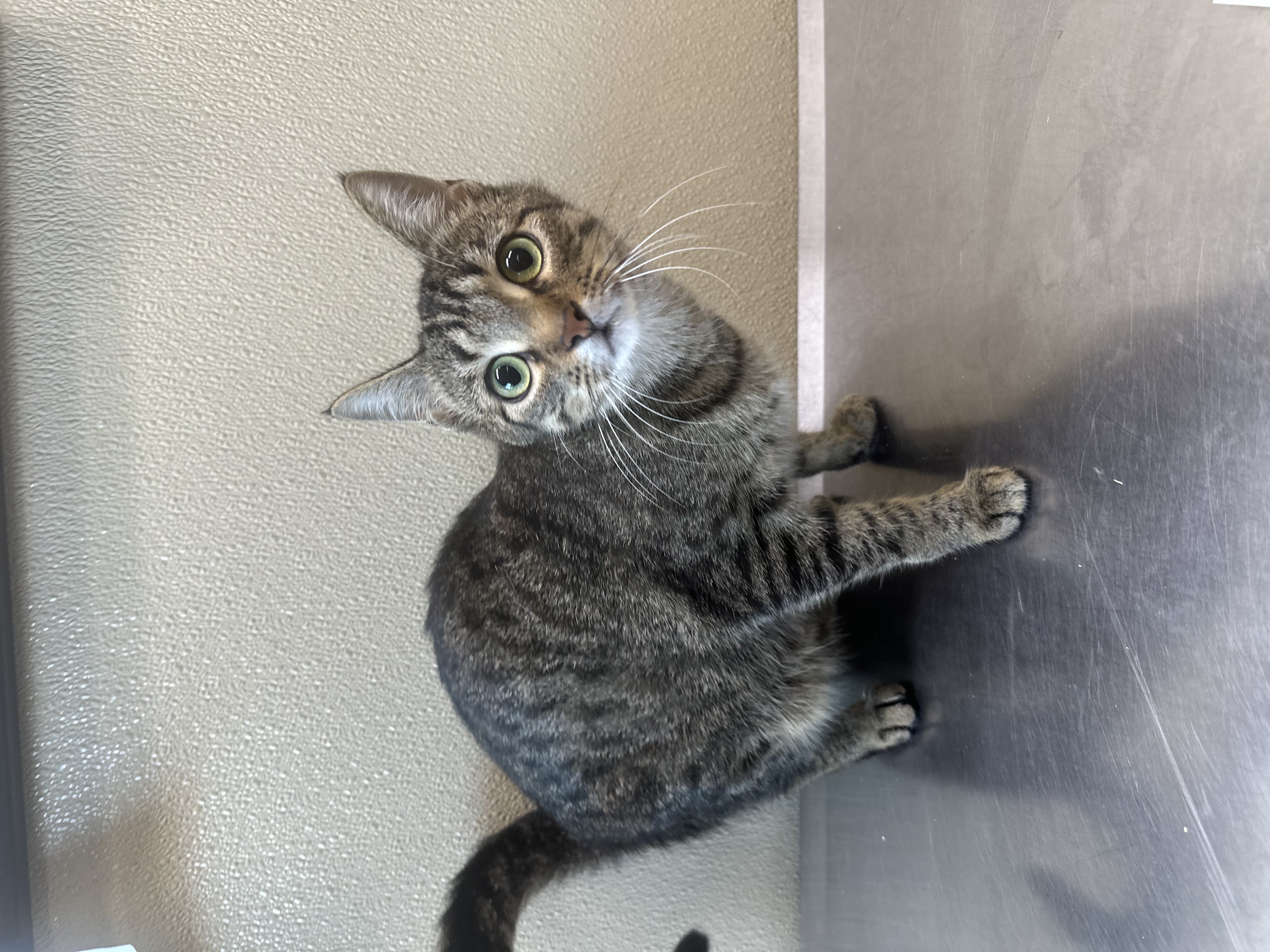 She is a female grey cat, white tips on front paws and white rear legs. Her sweetest quality is she has her left ear is missing !!
