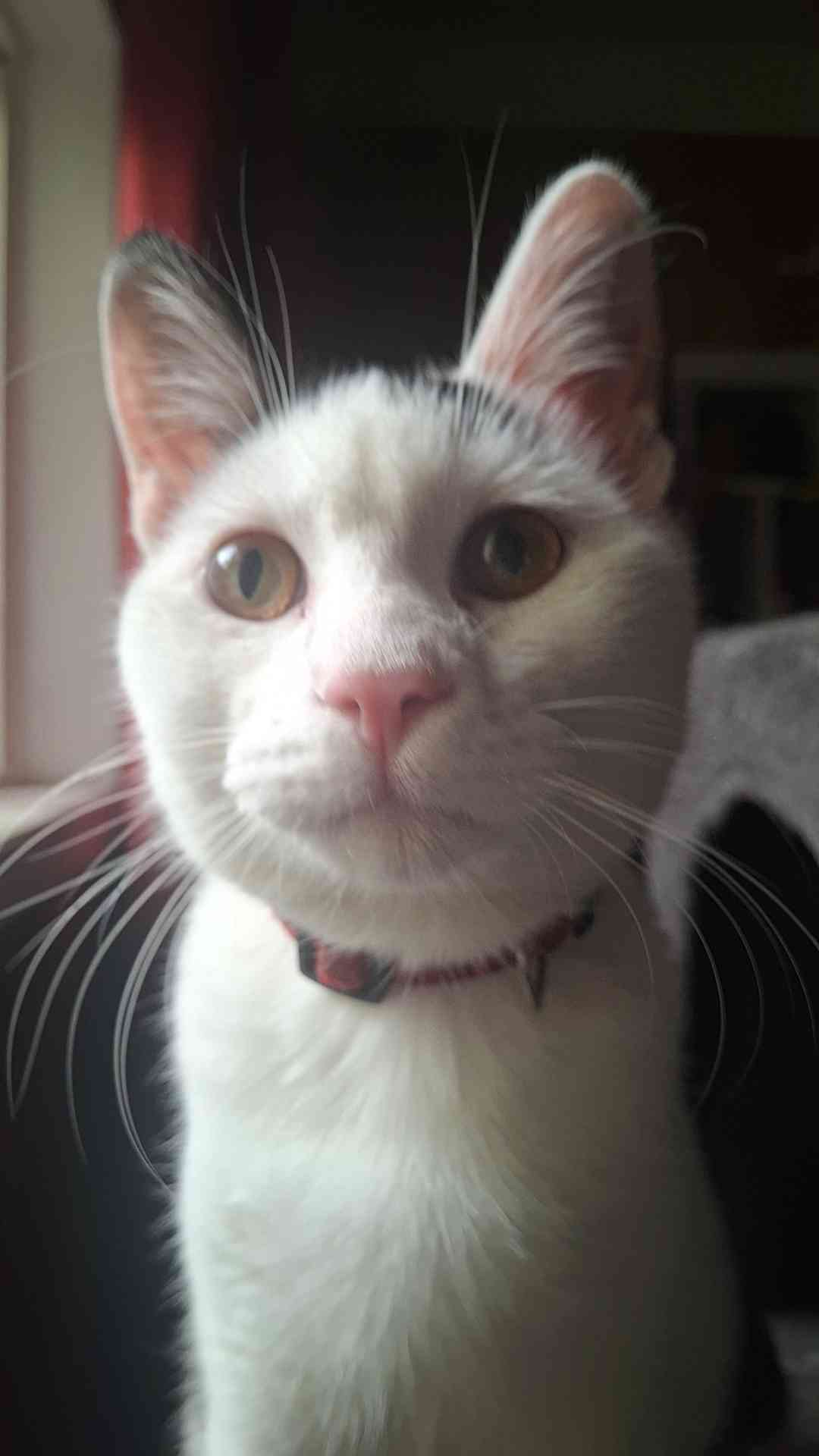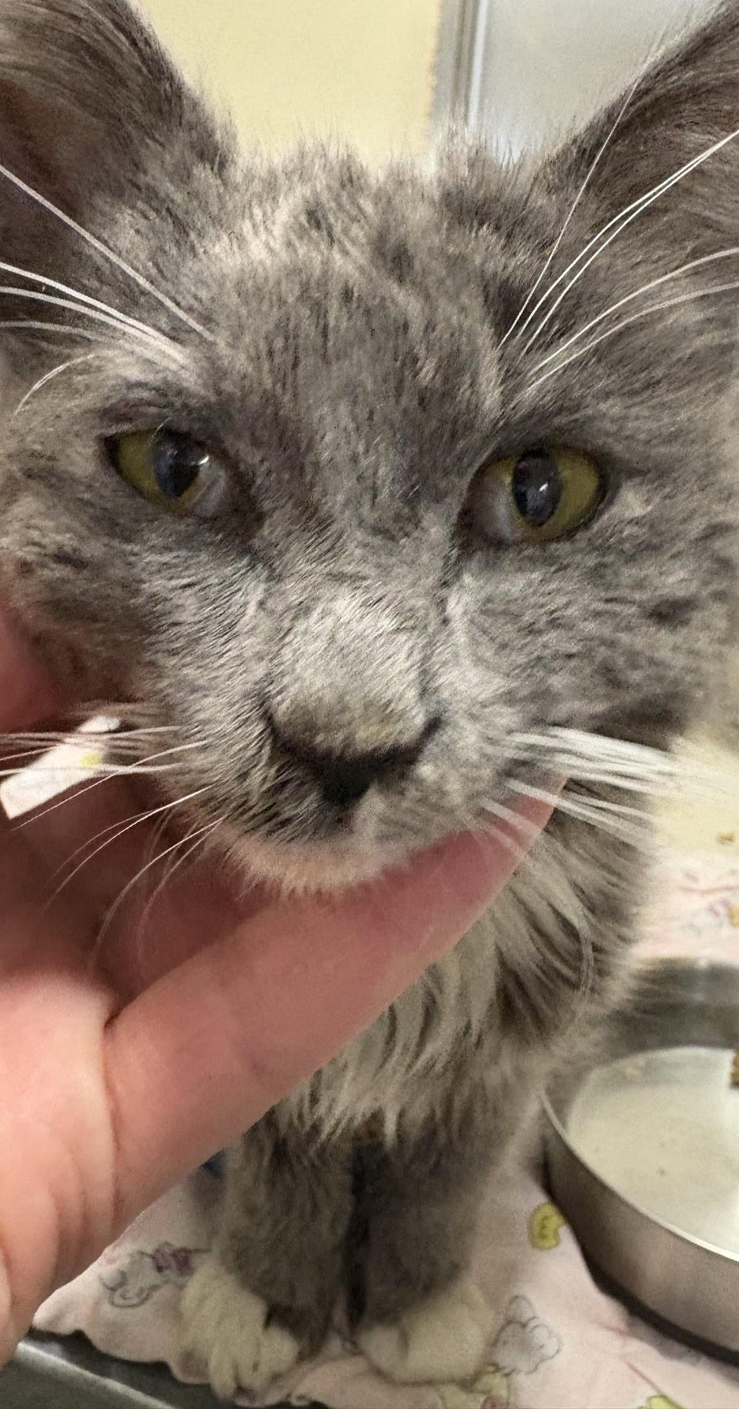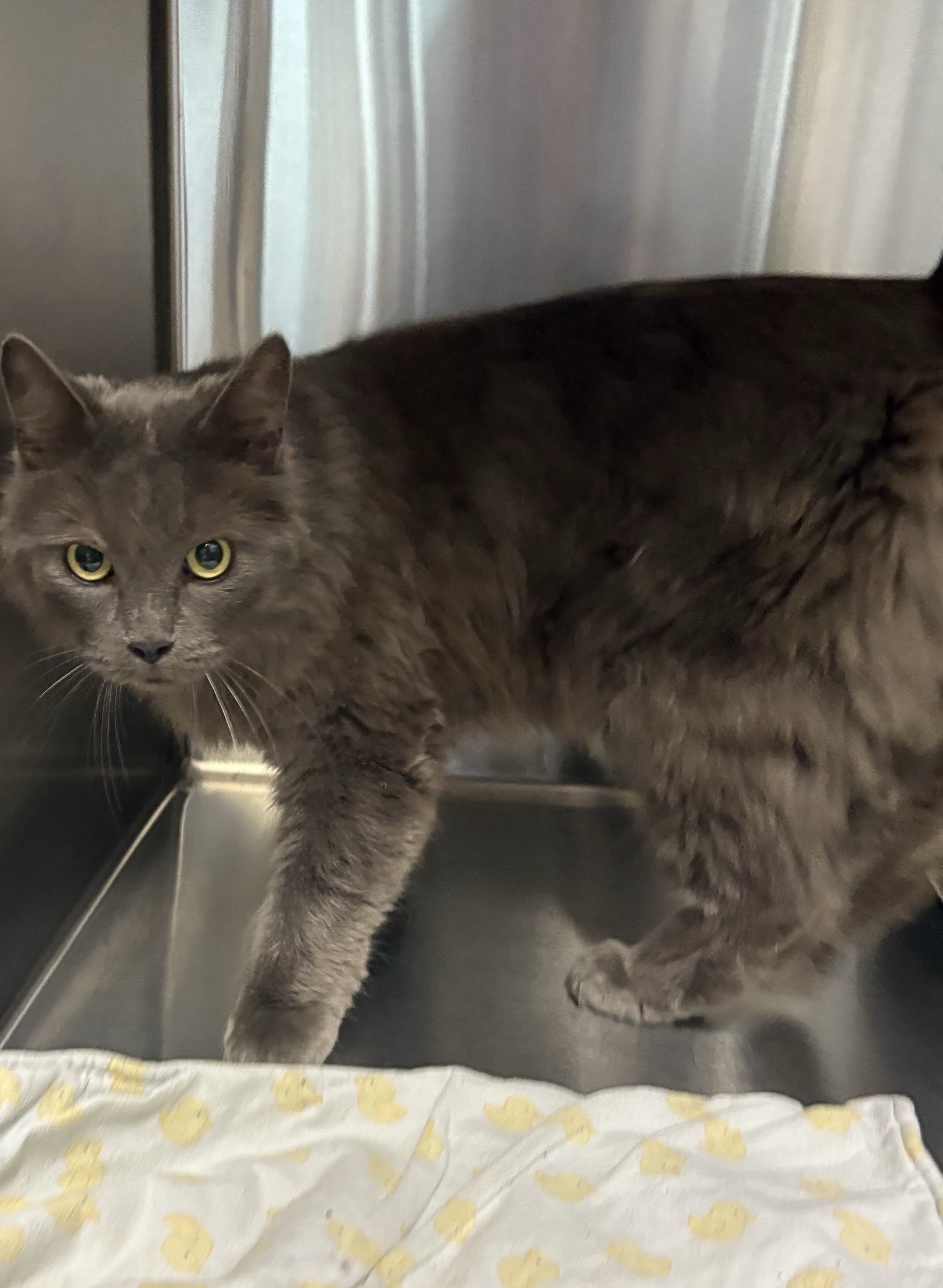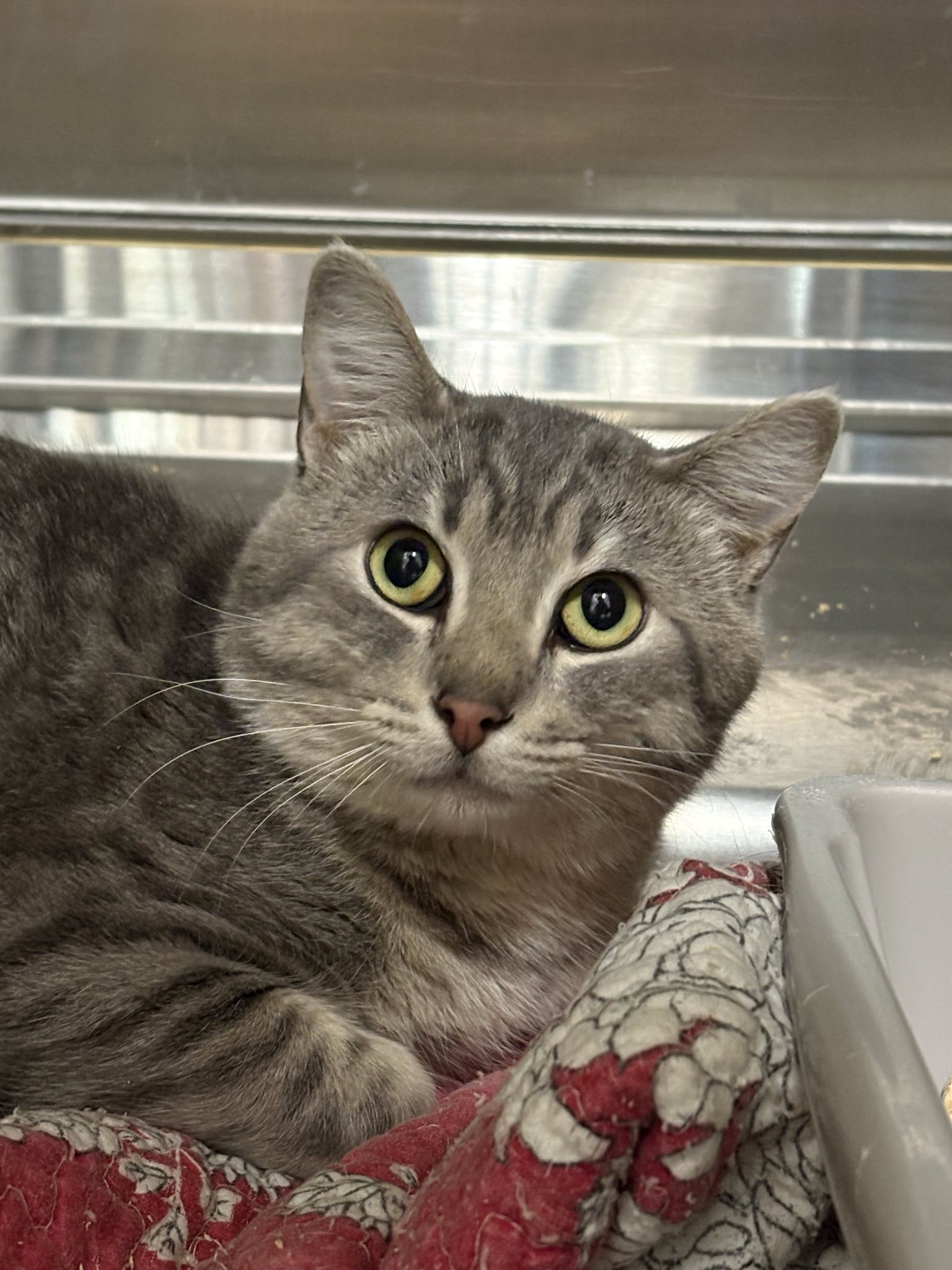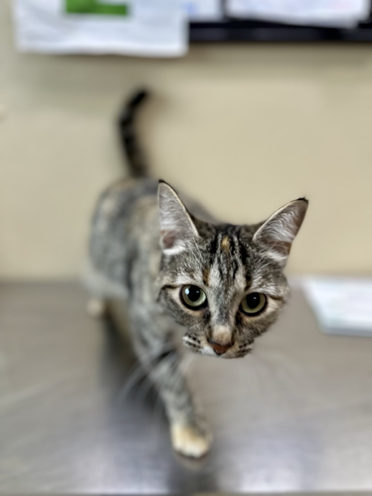 She is a female grey cat, white tips on front paws and white rear legs. Her sweetest quality is she has her left ear is missing !!