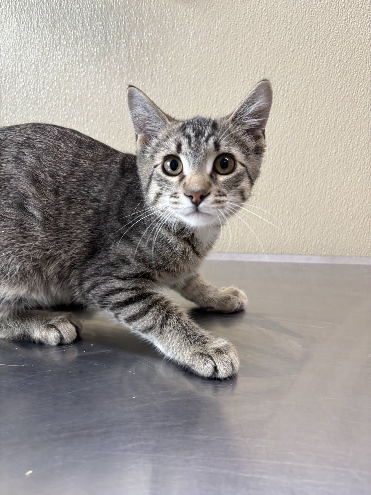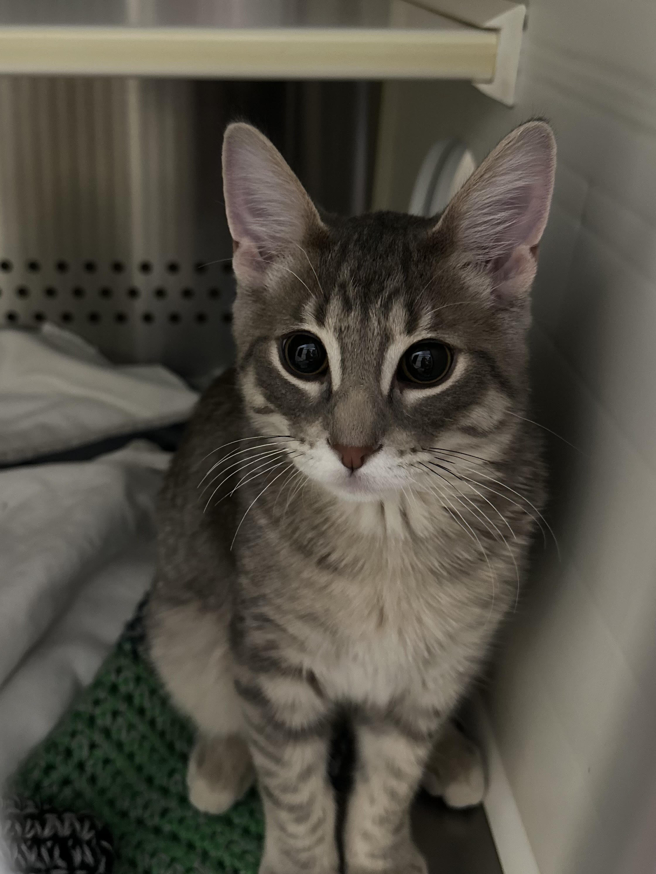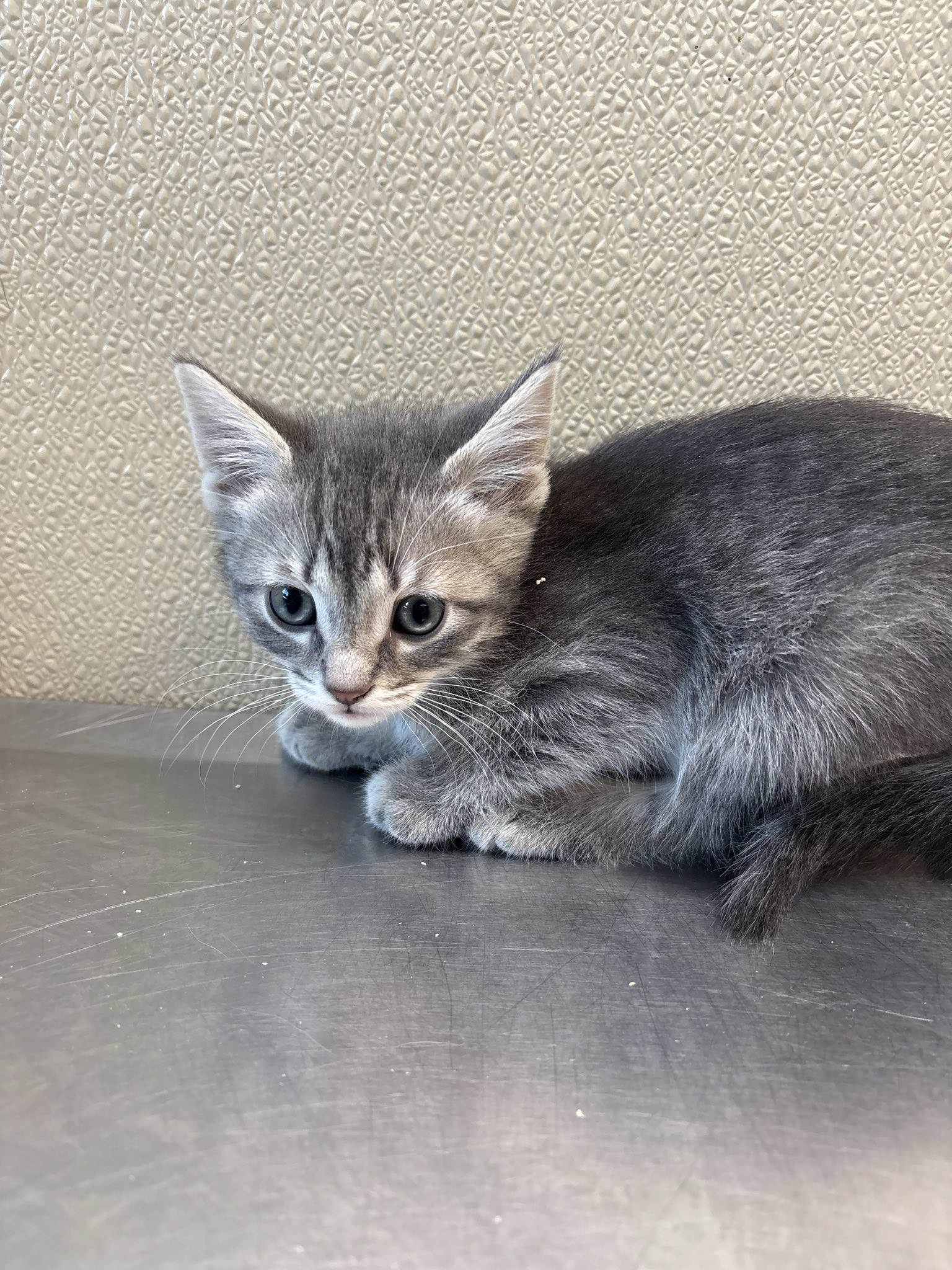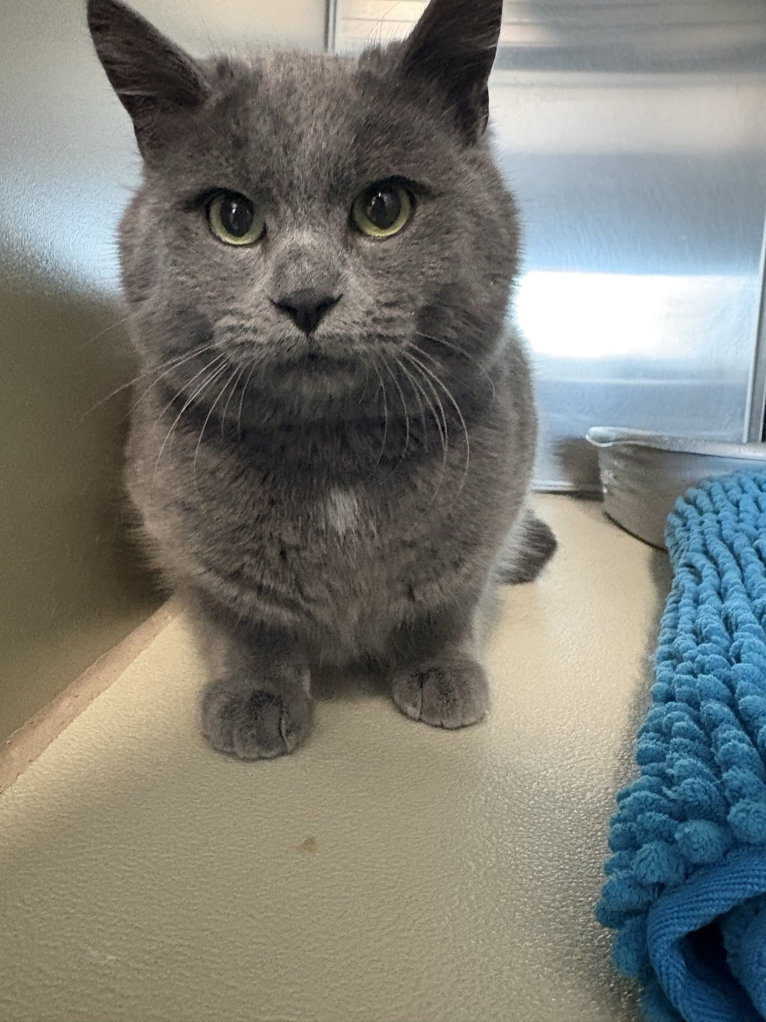 She is a female grey cat, white tips on front paws and white rear legs. Her sweetest quality is she has her left ear is missing !!