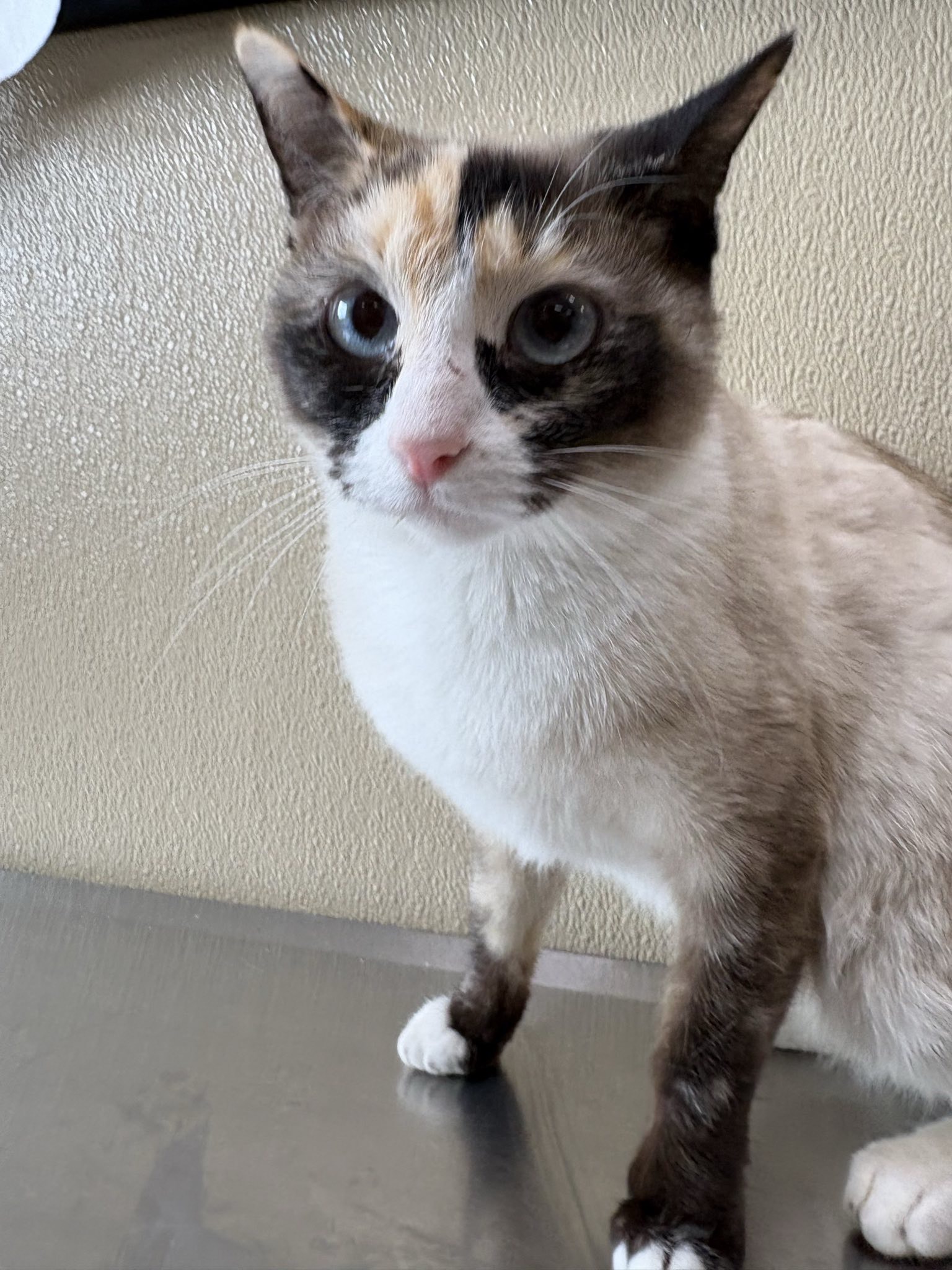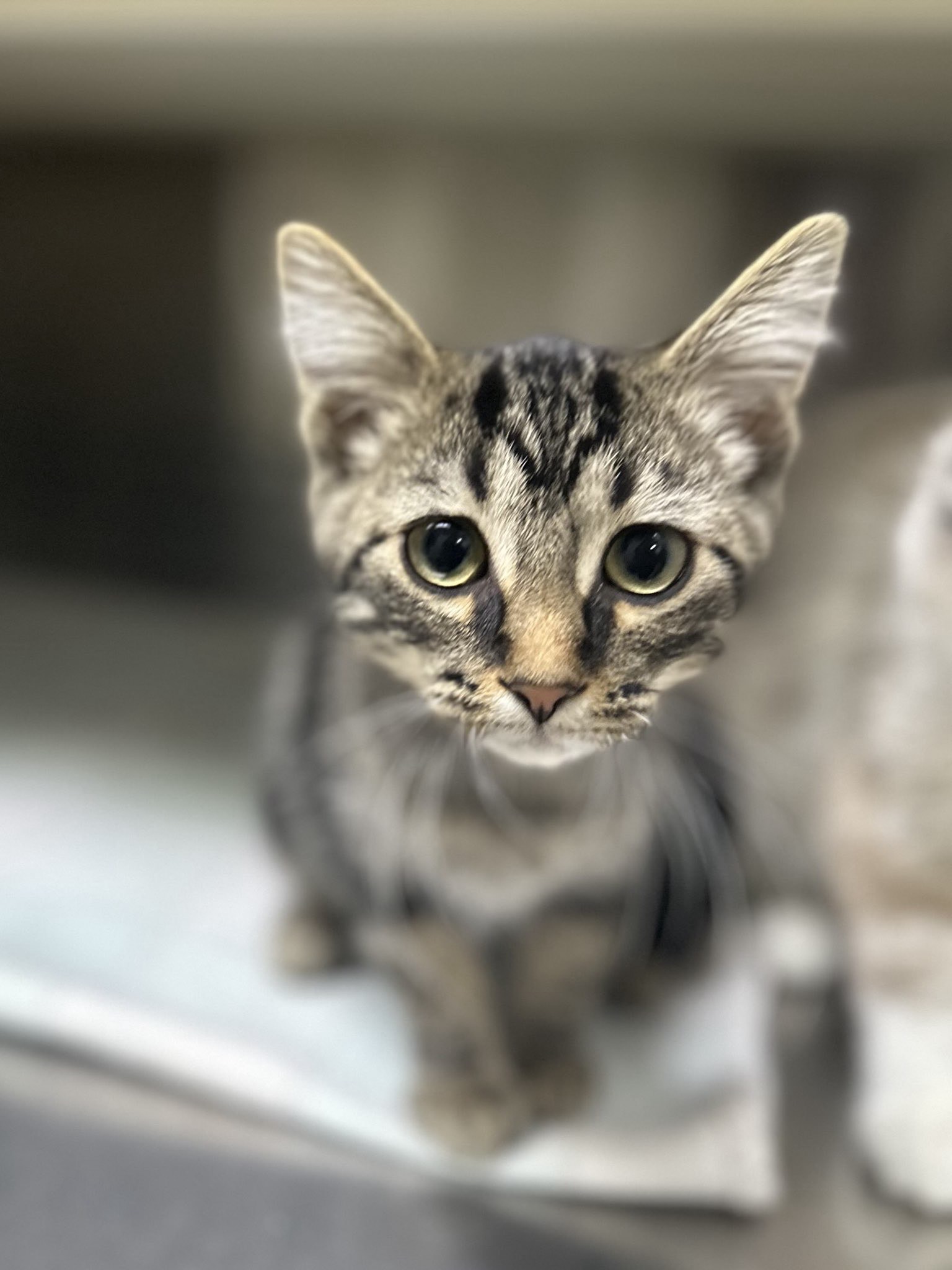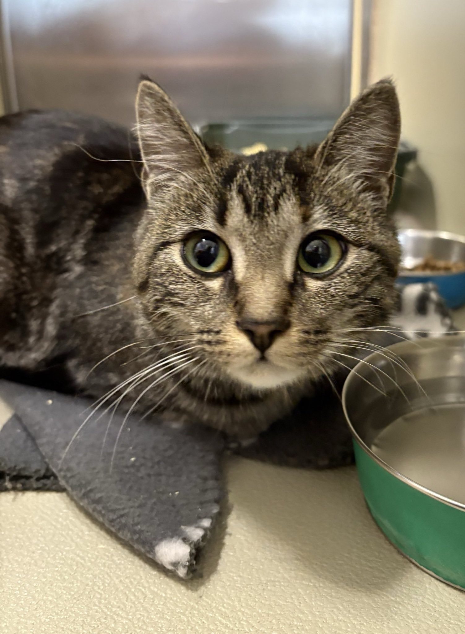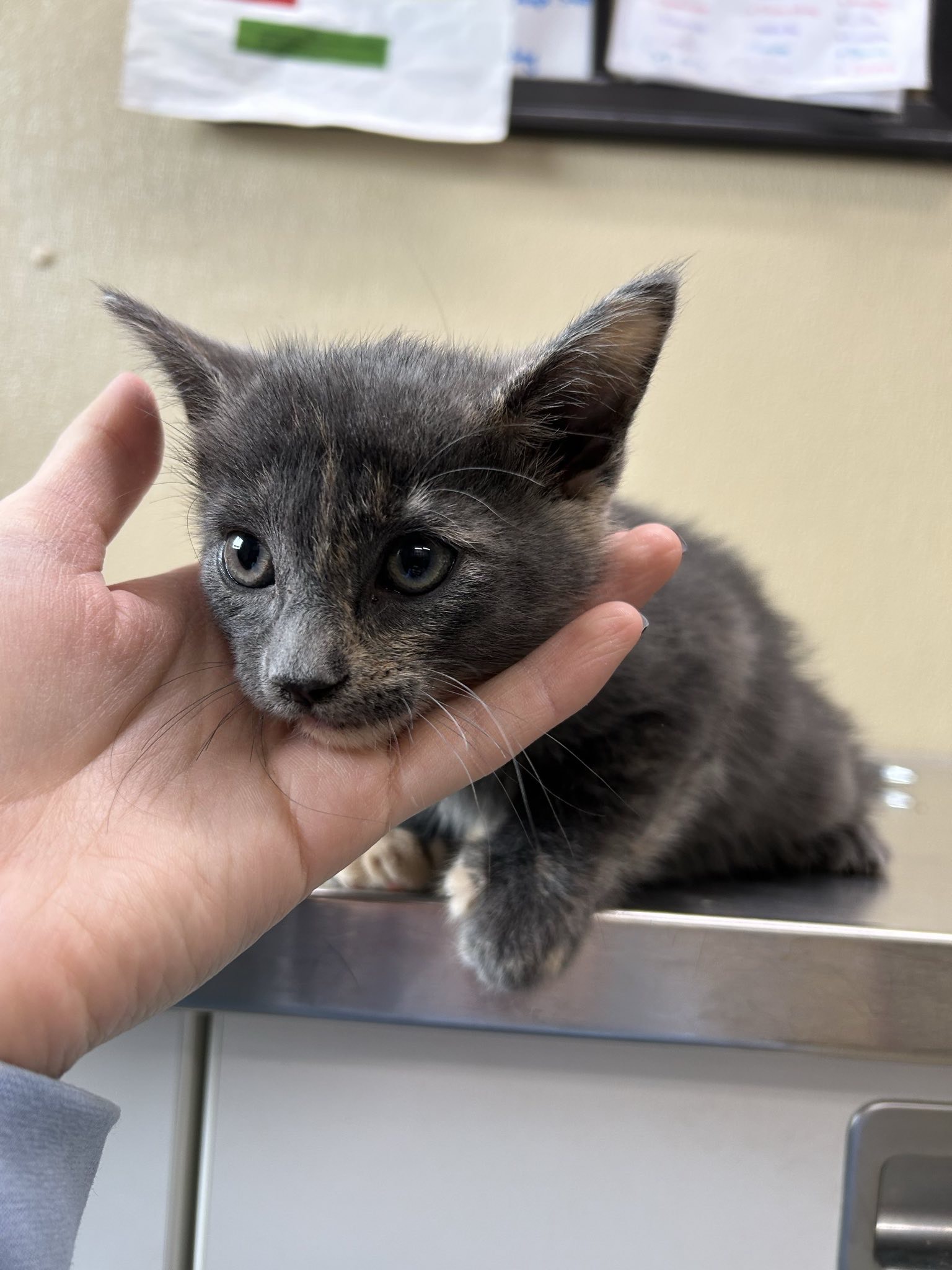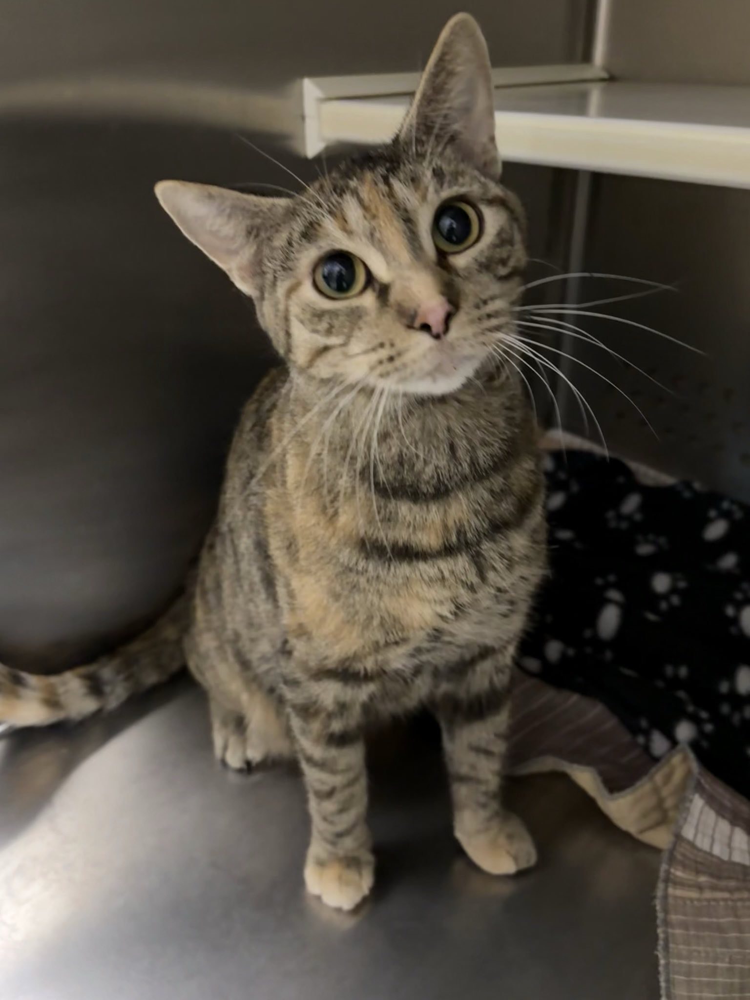She is a female grey cat, white tips on front paws and white rear legs. Her sweetest quality is she has her left ear is missing !!