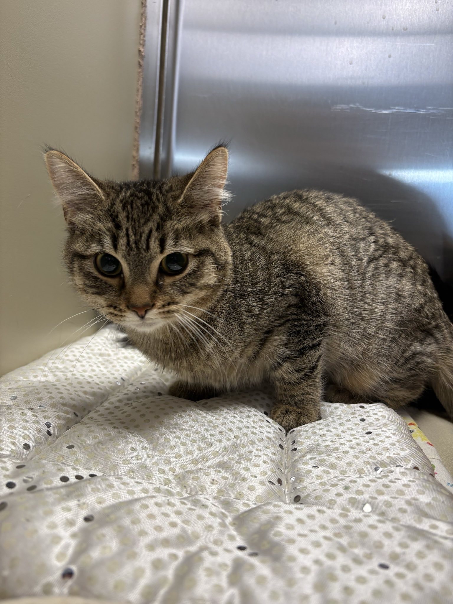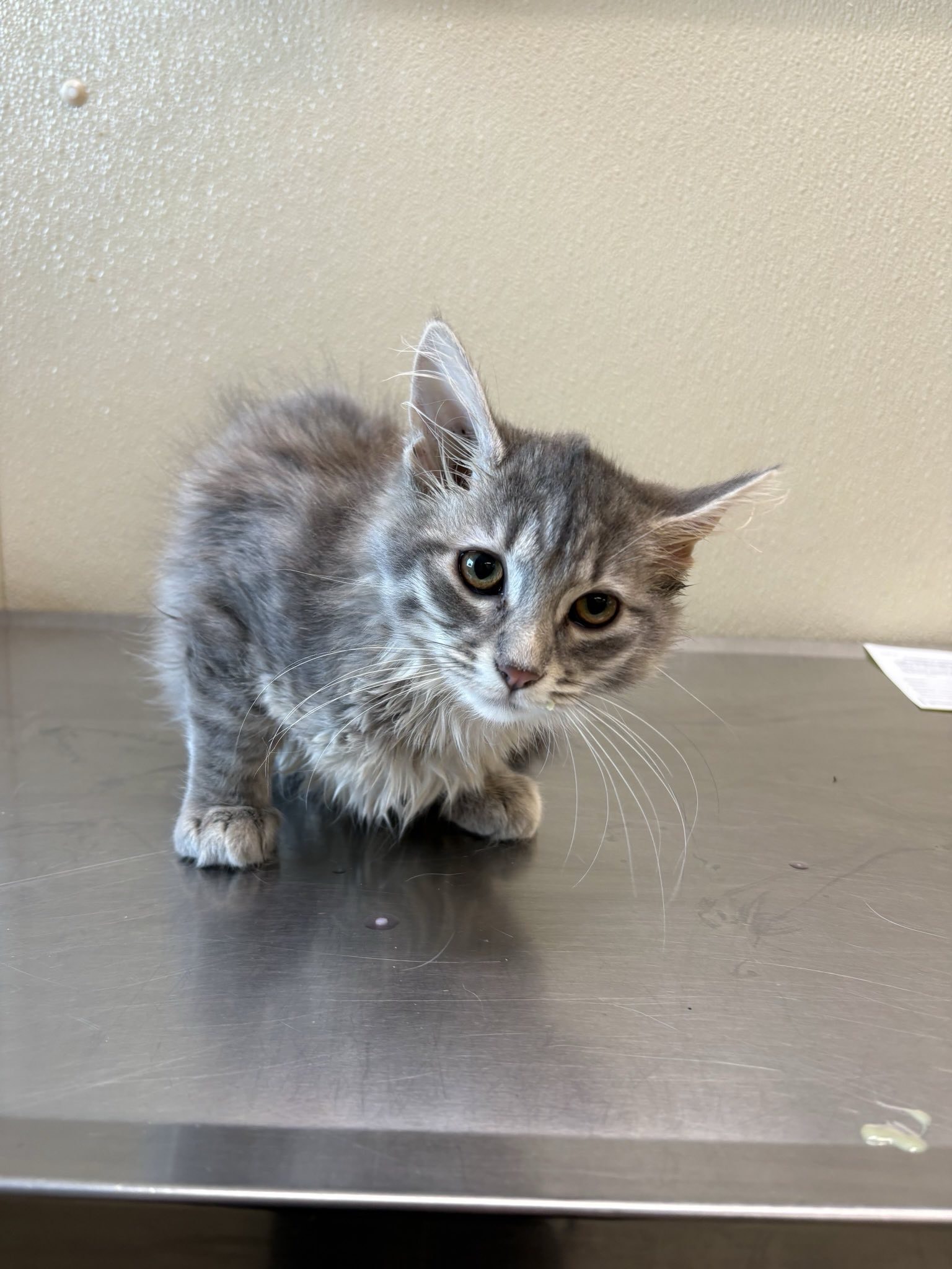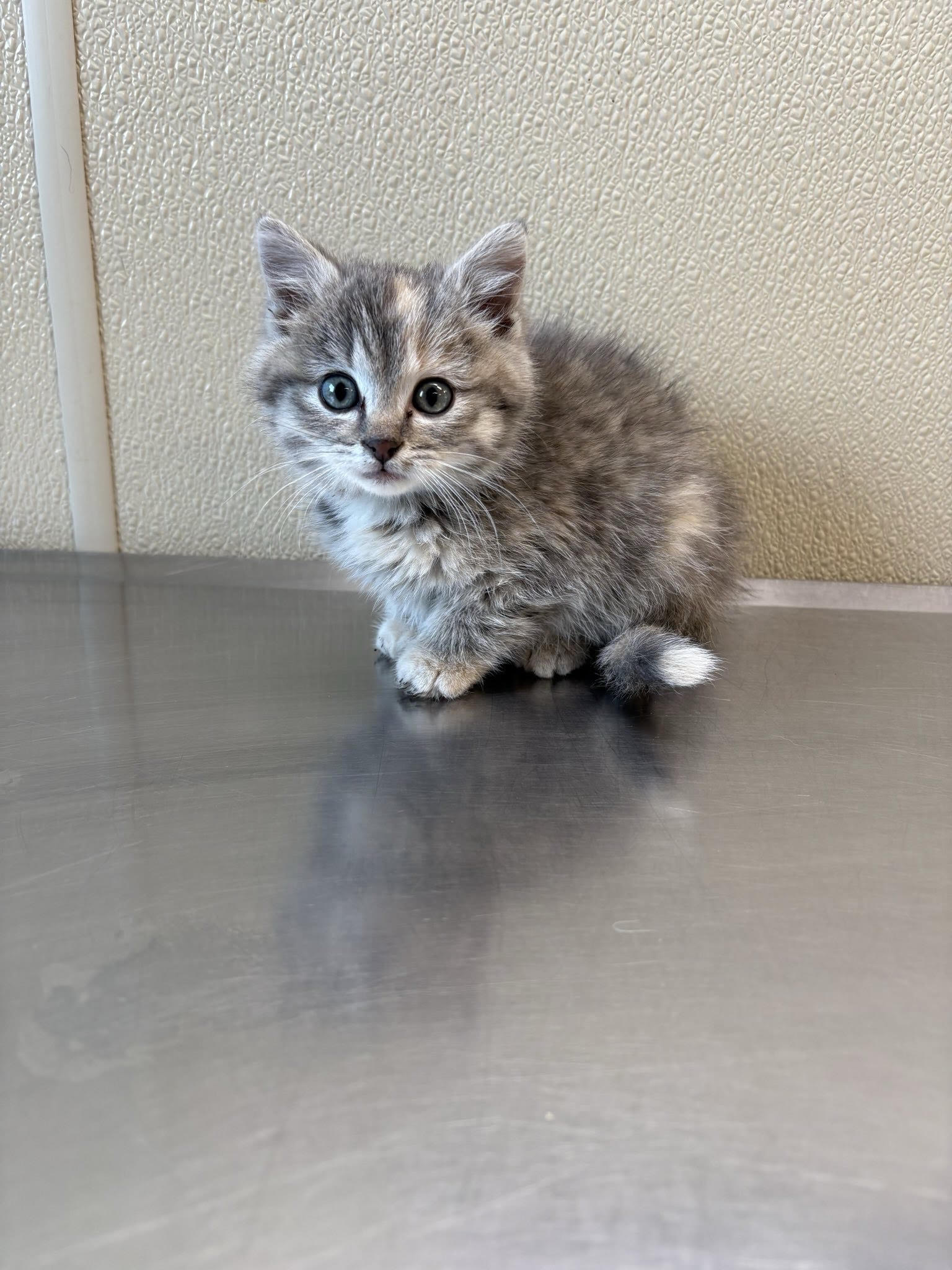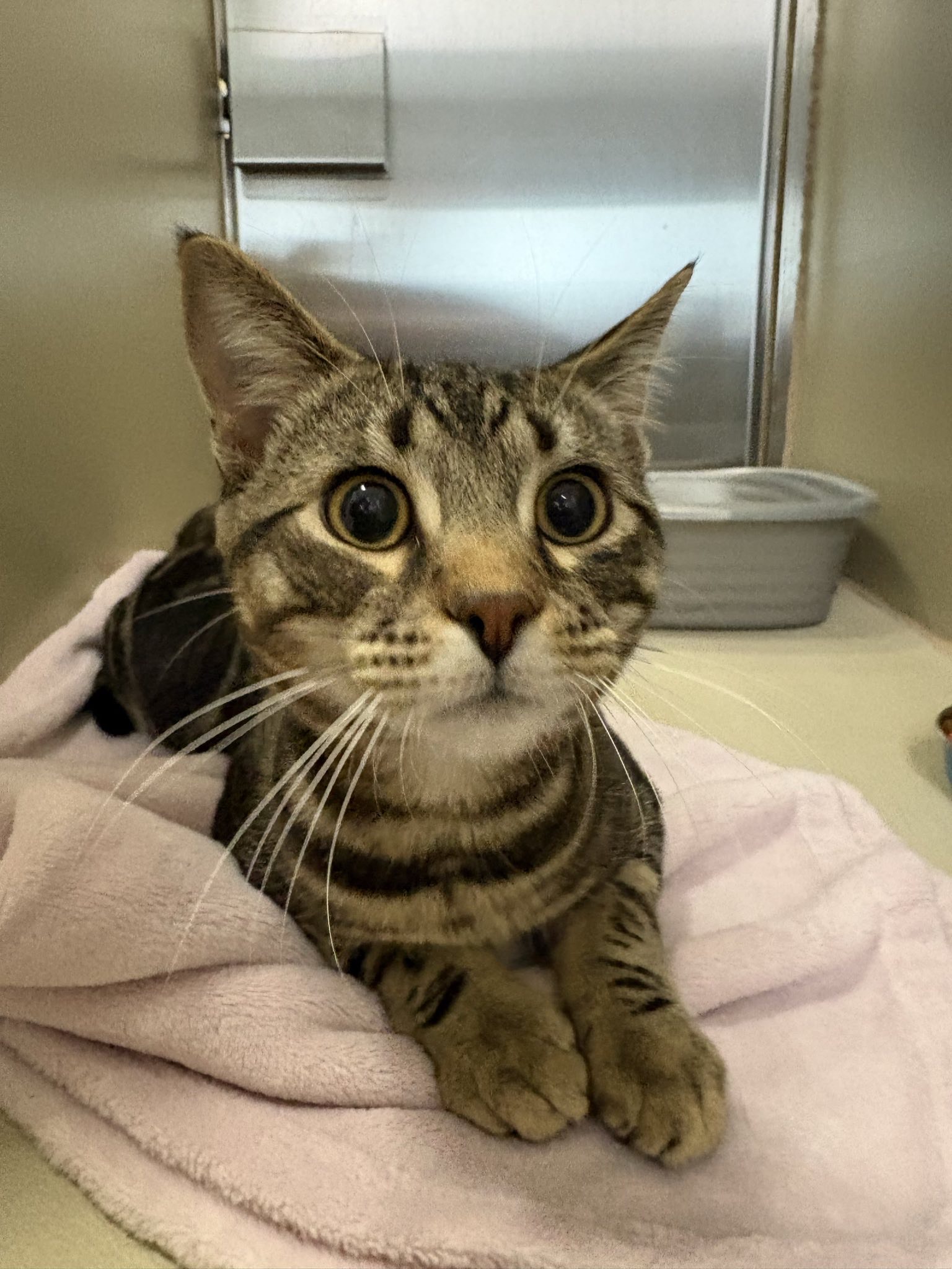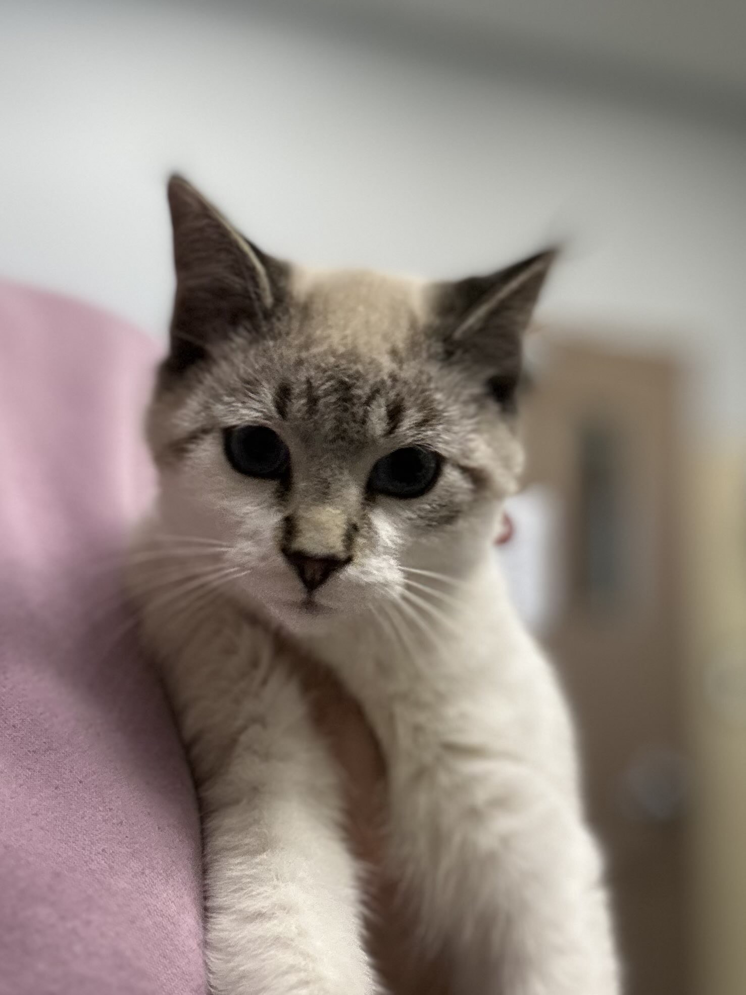She is a female grey cat, white tips on front paws and white rear legs. Her sweetest quality is she has her left ear is missing !!